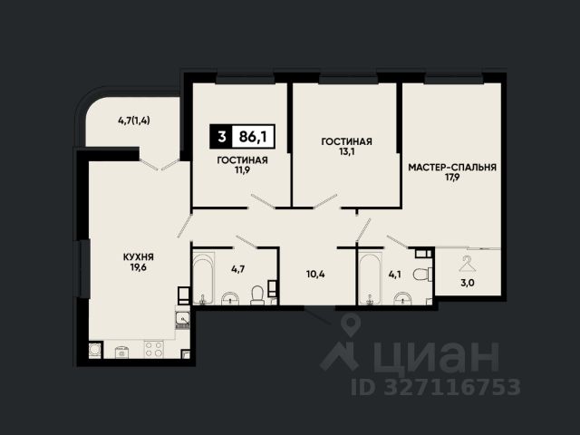 Просторная кухня-гостиная и три отдельные комнаты — удобное разделение зон для жизни, работы и отдыха;