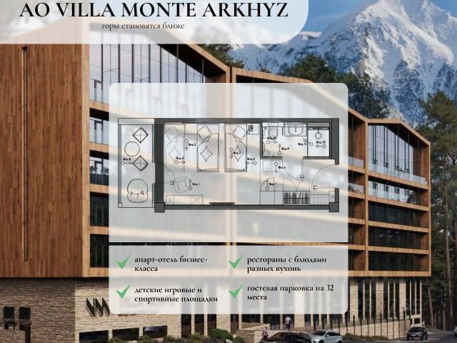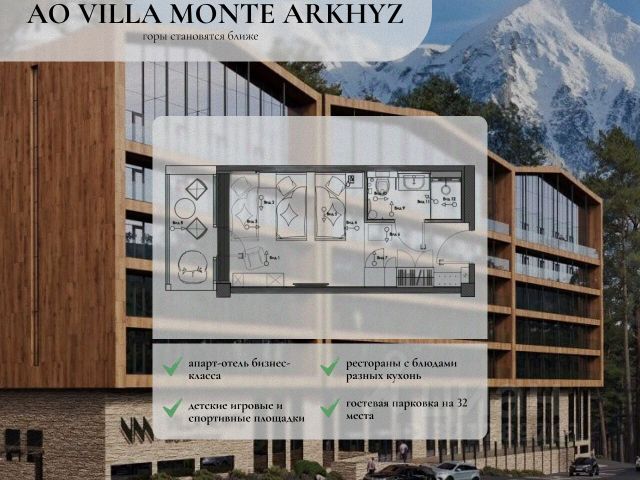 Высокодоходный апарт-отель в сердце Архыза. Отель - наполненный технологиями, с высоким уровнем комфорта и сервиса. Каждый номер — это готовый к сдаче актив под управлением, гарантированно приносящий стабильный доход с минимальным риском. VILLA MONTE — апарт-отель бизнес-класса, где каждая деталь продумана для удобства гостей. VILLA MONTE предлагает высокое качество строительства, использование современных материалов и технологий, а также продуманную планировку апартаментов. Апартаменты, которые подойдут для удовлетворения различных потребностей и предпочтений. Компактность и уют создают особую атмосферу спокойствия. До шести этажей. Такое решение обеспечивает комфорт и безопасность, позволяя жителям наслаждаться видом из окна и свежим воздухом. Для гостей предусмотрена гостевая парковка на 32 места. На территории комплекса будут организованы детские игровые и спортивные площадки. Также будет проведено озеленение. Социальные объекты на территории и поблизости: - рестораны с блюдами разных кухонь; - спа-салон; - магазин с необходимыми товарами для повседневной жизни. Все эти объекты находятся в шаговой доступности от дома. Дополнительные особенности: - инфраструктура для хранения и проката спортивного инвентаря; - система "умный дом" в квартирах позволяет управлять освещением, температурой и безопасностью на расстоянии. Купить квартиру в новостройке без отделки в республике Карачаево-Черкесская.