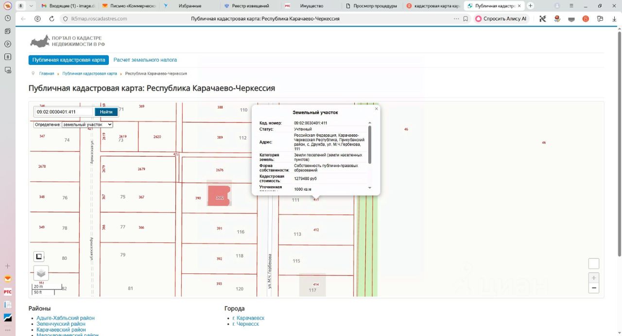 земельный участок, адрес: Карачаево-Черкесская Республика, Прикубанский район, Дружбинское СП, Ул. Гербекова, 111, к.н 09:02:0030401:411