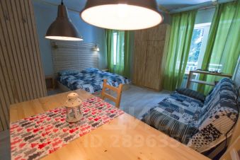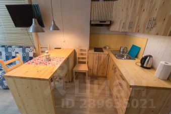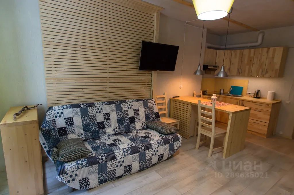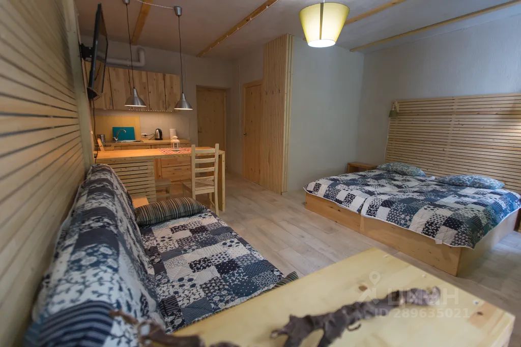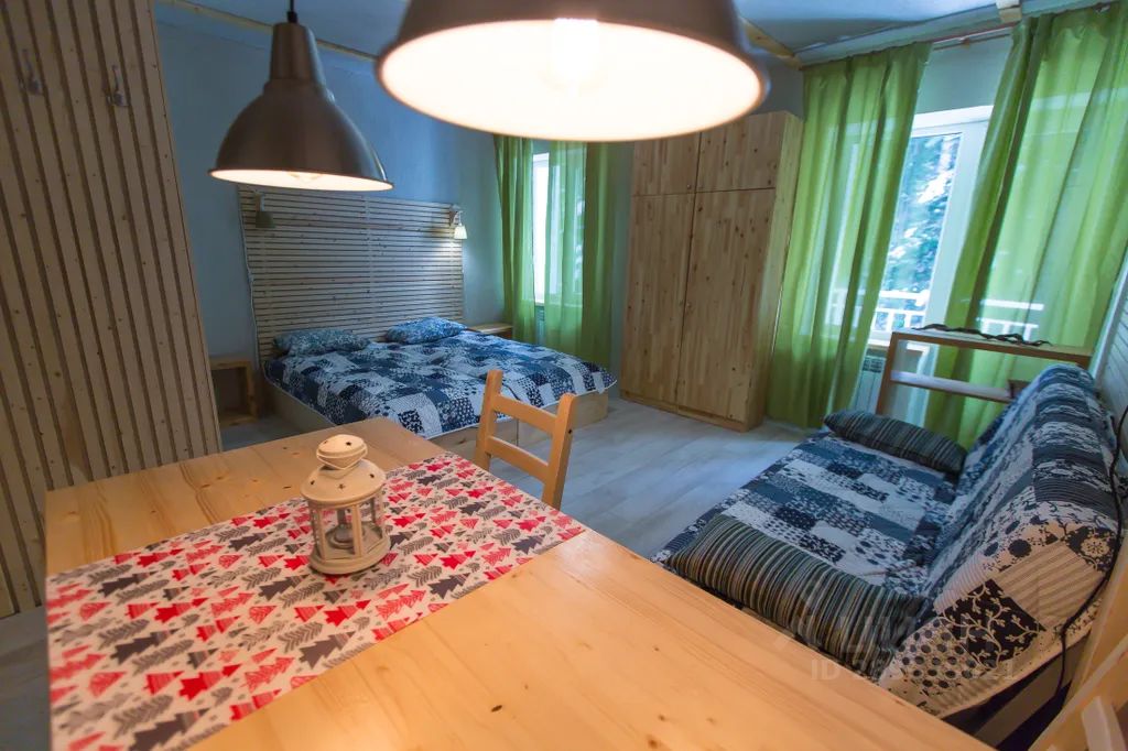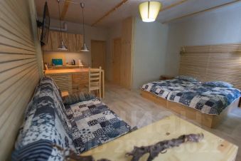 Квартира-студия с отдельным санузлом с душевой кабиной. Мебель деревянная из сосны. Отделка выполнена из экологичных, не аллергенных материалов. Балкон с видом на еловый лес.