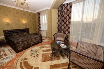 В номере большая кровать, раскладное кресло, стол, шкаф, кабельное и спутниковое ТВ, телефон, кондиционер, DVD, холодильник, чайник, посуда, Интернет WI-FI. Площадь комнаты - 24 кв.м.В ванной комнате - халат, фен, гигиенические средства разового пользования.