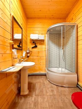 Собственная ванная комната со всеми удобствами: душевая кабина, душ, фен, зеркало, раковина, разовые зубные щетки, мыло, шампунь, гели для душа, комплект свежих полотенец, удобные тапочки, унитаз, гигиенический душ, мусорное ведро.