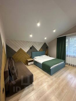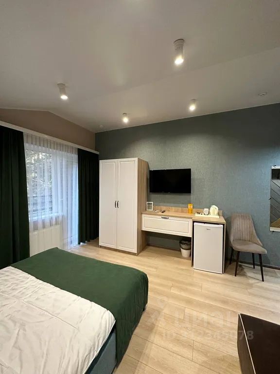 Комната: двуспальная кровать, раскладной диван, прикроватные тумбочки, подвесная тумба, холодильник, чайная станция, TV.