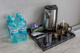 Для комфорта гостей предусмотрены: бутилированная вода, чай, кофе и сахар, а также телевизор, рабочая зона и шкаф для хранения вещей. Ванная комната оборудована душем и укомплектована одноразовыми туалетными принадлежностями: шампунем, гелем для душа, зубной щёткой и пастой.