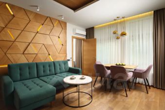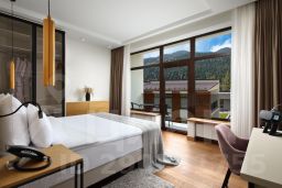 Просторный двухкомнатный номер идеально подойдет как для семейного отдыха, так и для пар. В номере отдельная спальня, из окон которой открывается незабываемый вид на вершины гор и хвойный лес. В кухне-гостиной расположен диван, который можно использовать как полноценное спальное место. В дизайне номера преобладают оттенки зеленого, которые мы дополнили деревом, чтобы вы ощутили единение с природой не выходя из номера.