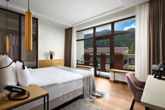Просторный двухкомнатный номер идеально подойдет как для семейного отдыха, так и для пар. В номере отдельная спальня, из окон которой открывается незабываемый вид на вершины гор и хвойный лес. В кухне-гостиной расположен диван, который можно использовать как полноценное спальное место. В дизайне номера преобладают оттенки зеленого, которые мы дополнили деревом, чтобы вы ощутили единение с природой не выходя из номера.