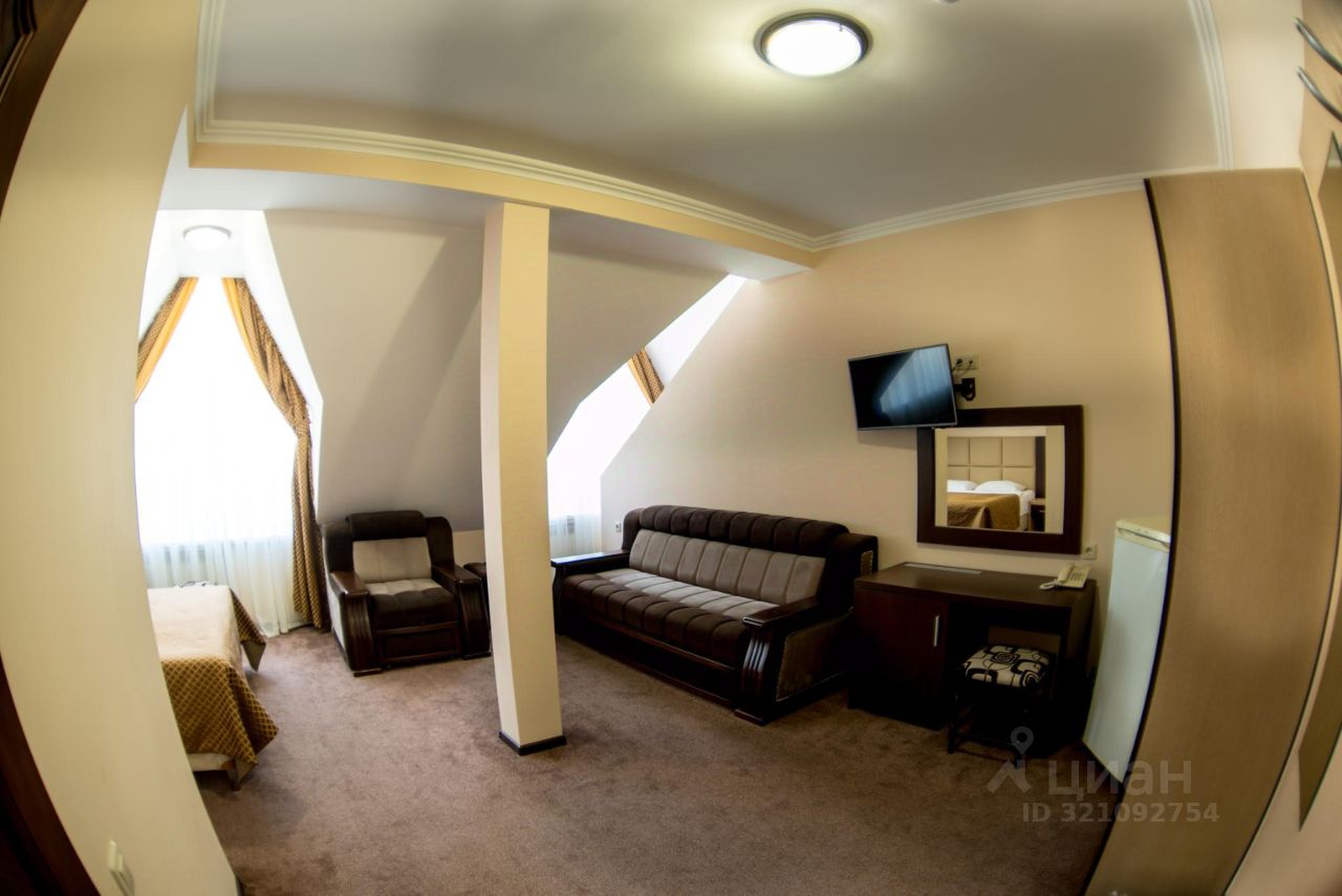 В номере: двуспальная кровать, 2 тумбы, шкаф, журнальный столик, стулья, диван, кресло, холодильник, телевизор, эл.чайник, шкаф с посудой, телефон, санузел (ванная и туалет).