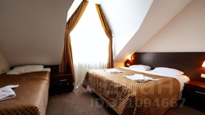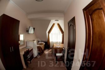 В номере: три кровати, тумбы, шкаф, стол, стулья, холодильник,телевизор, телефон, санузел (ванна и туалет).