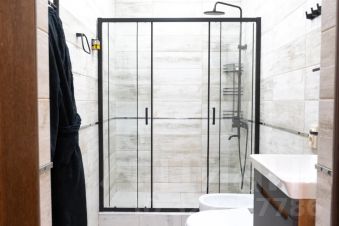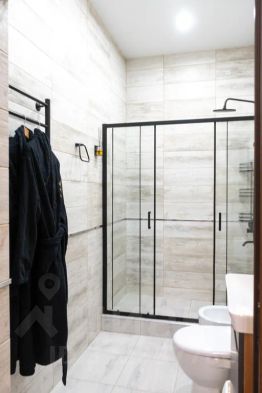 Душевая со всеми необходимыми принадлежностями: халаты, тапочки, полотенца, фен, косметические средства.