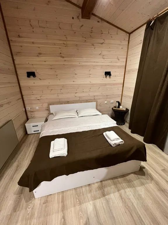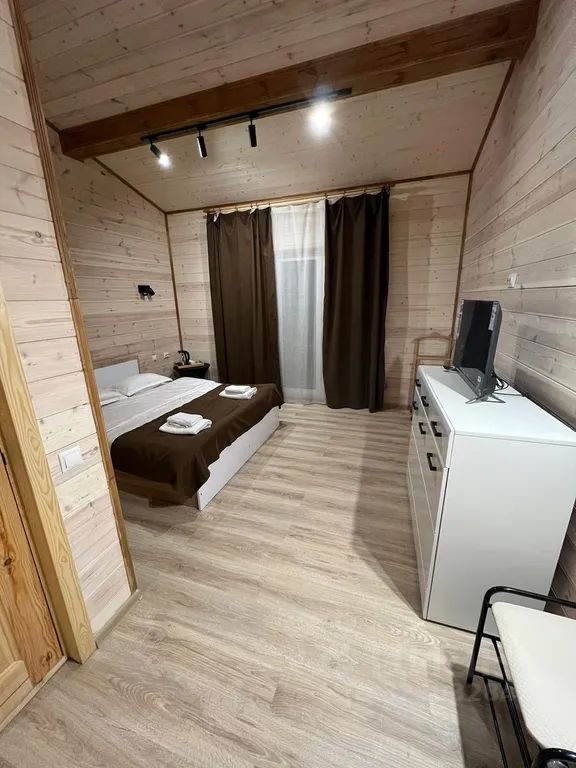 В номере двуспальная кровать, телевизор, холодильник, чайник, санузел.