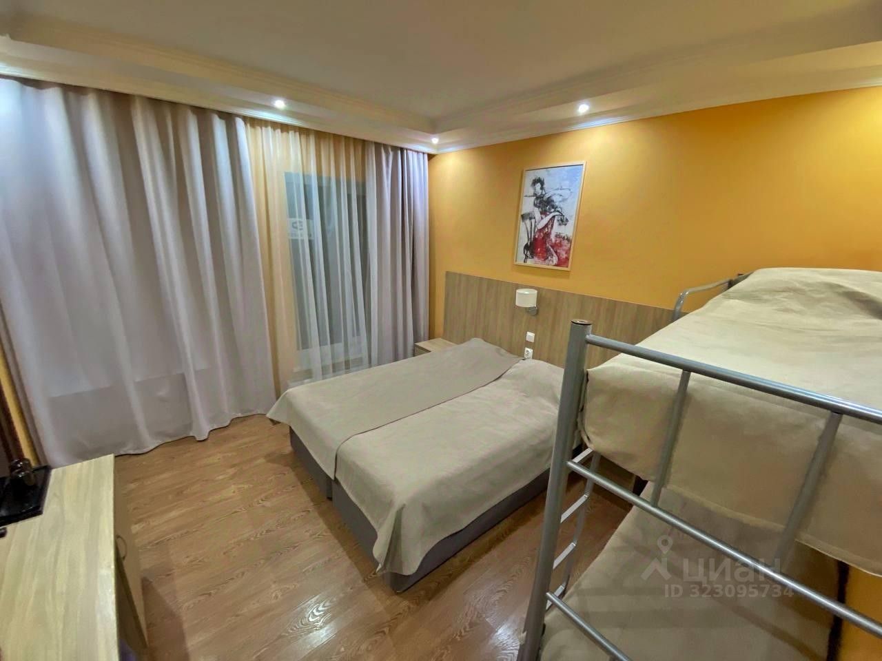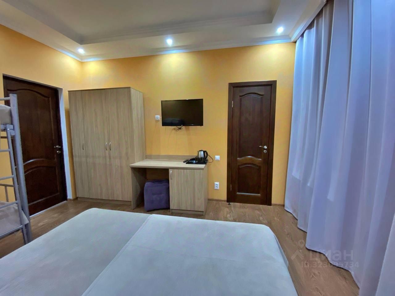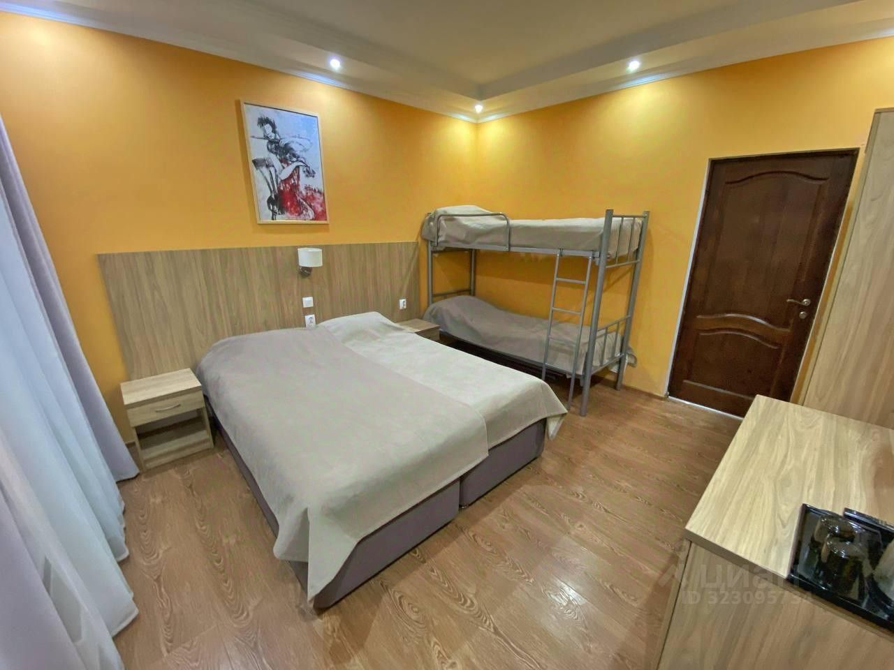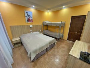 Четырёхместный номер с двухъярусной кроватью — удобный вариант для семьи или небольшой компании. В номере установлены две односпальные кровати и одна двухъярусная кровать, что обеспечивает комфортное размещение до четырёх человек. Гостям доступны телевизор, рабочая зона и шкаф для одежды. В ванной комнате — душ, а также одноразовые туалетные принадлежности: шампунь, гель для душа, зубная щётка и паста. Интерьер выполнен в светлых, нейтральных тонах, создающих приятную и спокойную атмосферу. Идеален для активного отдыха в горах и непринуждённого проживания.