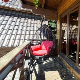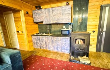 холодильник, микроволновая печь, чайник, два больших двуспальных дивана, стол, стулья, TV, необходимая посуда, газовая плита, камин.