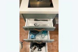 - Кухонная зона со всеми необходимыми удобствами, включая посуду, плиту, чайник, микроволновую печь и холодильник.