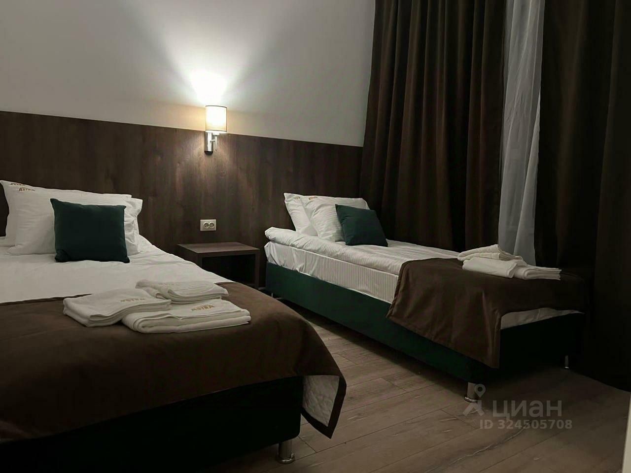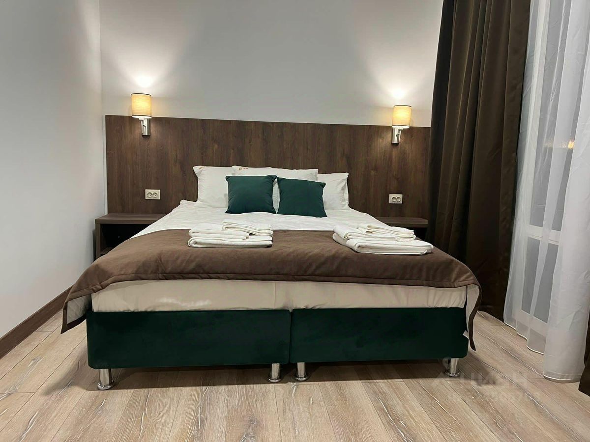 Номер состоит из одной комнаты в которой имеется одна двуспальная кровать. Так же в номере: шкаф, холодильник, электрочайник, чайный набор, фен, гигиенические принадлежности, набор полотенец, телевизор, санузел.