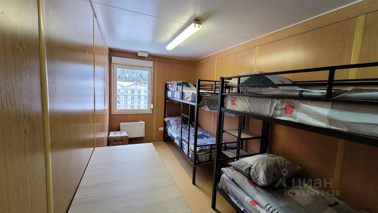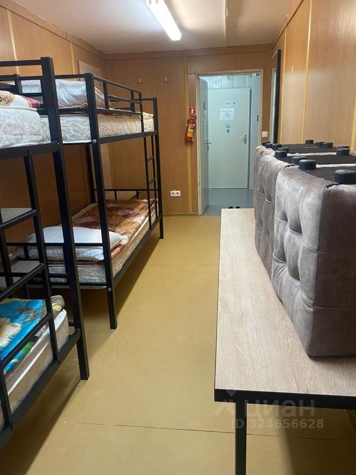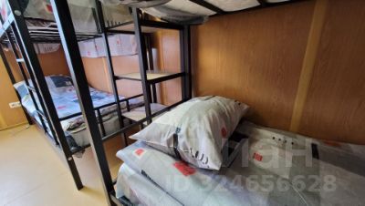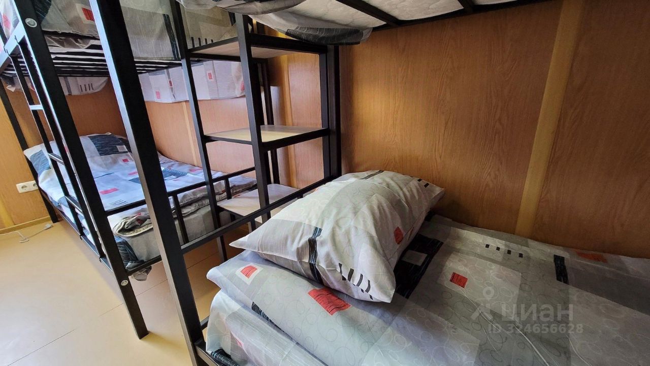 Кровать в 4-местном общем номере. В номере 2 двухъярусные кровати, один стол, четыре пуфика, вешалка для одежды, зеркало.
