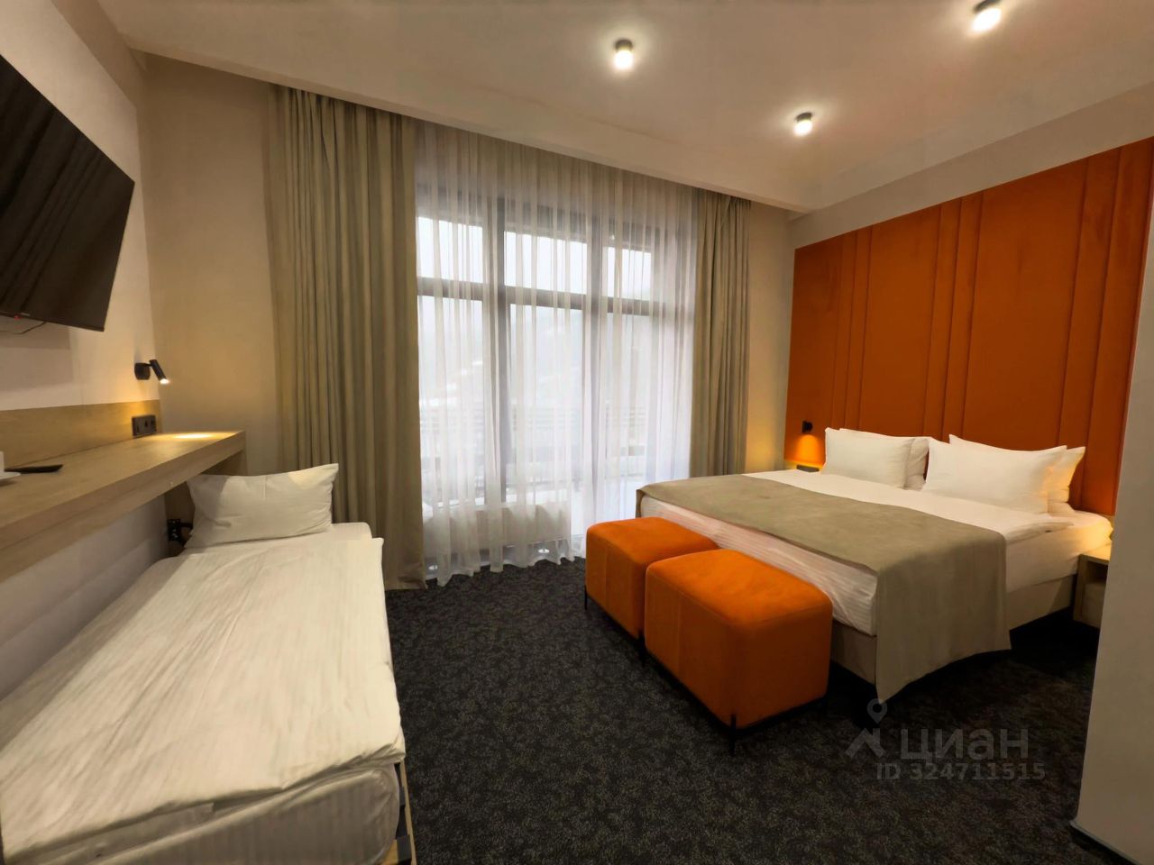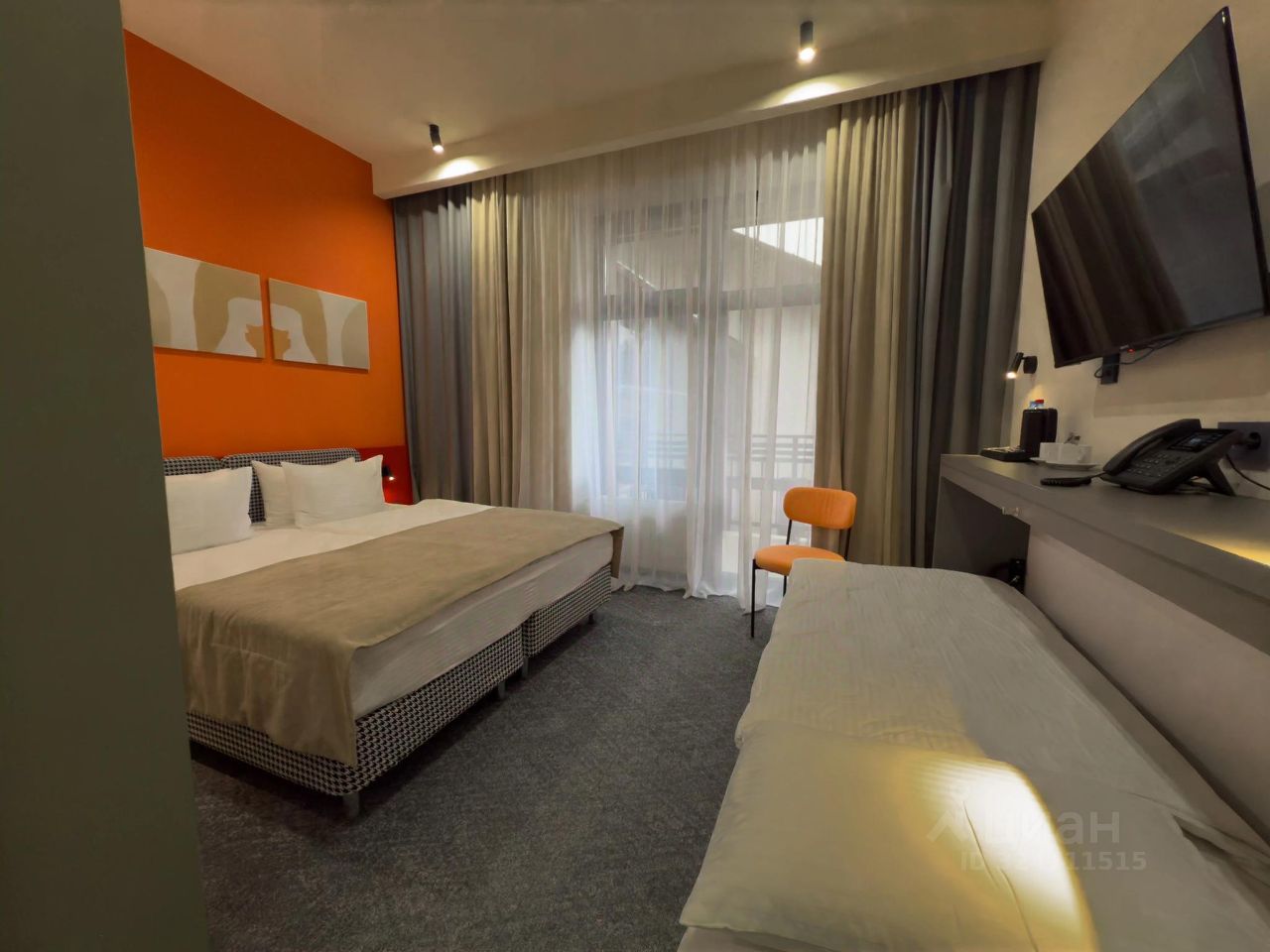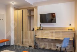 Однокомнатный номер с дополнительным спальным местом в виде раскладной кровати. Идеально для небольшой компании или семьи с ребенком. В номере есть всё необходимое для проживания: кровати с эргономичными матрасами, места для хранения, гладильная станция и рабочий стол. В интерьере преобладают сочные цвета, заряжающие энергией и настраивающие на позитивный лад.