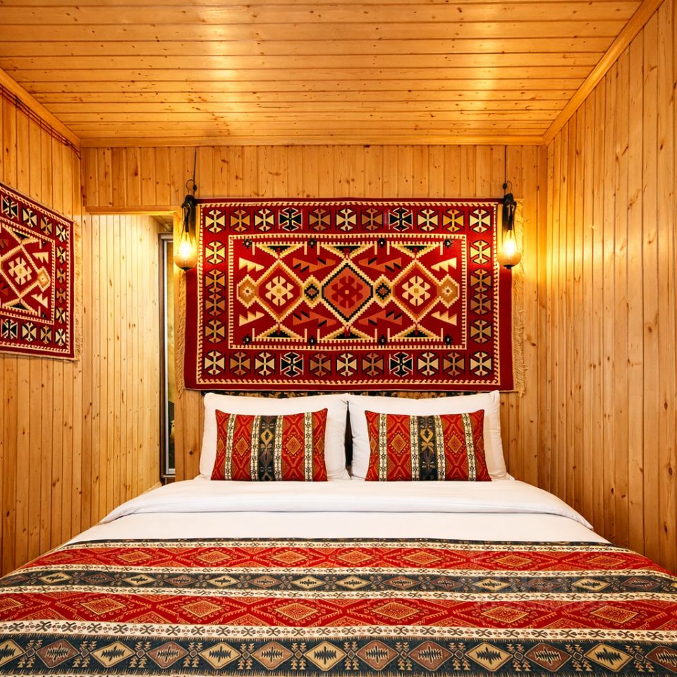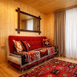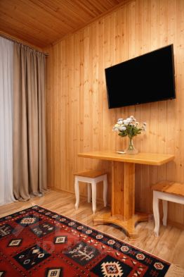 Двухместный улучшенный стандарт, выполненный из экологичного бруса, отличается тёплой атмосферой и естественным уютом. Натуральная фактура древесины создаёт ощущение близости к природе, при этом предполагая некоторую слышимость — характерную особенность деревянных интерьеров.