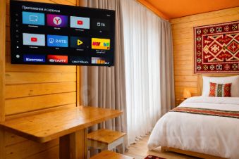 Двухместный стандартный номер, выполненный из экологичного бруса, отличается тёплой атмосферой и естественным уютом. Натуральная фактура древесины создаёт ощущение близости к природе, при этом предполагая некоторую слышимость — характерную особенность деревянных интерьеров.