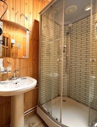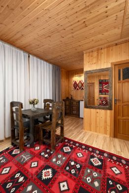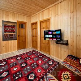 Четырёхместный комфортный номер, выполненный из экологичного бруса, отличается тёплой атмосферой и естественным уютом. Натуральная фактура древесины создаёт ощущение близости к природе, при этом предполагая некоторую слышимость — характерную особенность деревянных интерьеров.