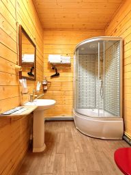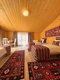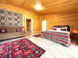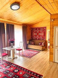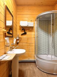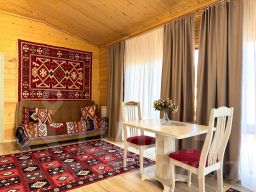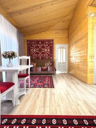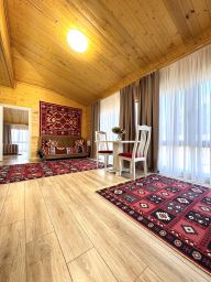 Трёхкомнатный улучшенный комфортный номер выполнен из экологичного бруса, что формирует благородную атмосферу тепла и природного уюта. Натуральная текстура древесины подчёркивает экологичность пространства и создаёт ощущение гармонии с природой, при этом предусматривая некоторую слышимость, характерную для деревянных построек.