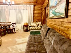 - Гостиная с панорамным остеклением (2 гостя). Панорамные окна от пола до потолка открывают живописный вид на горы. Отдельная обеденная зона для общих завтраков, ужинов или веселых посиделок.