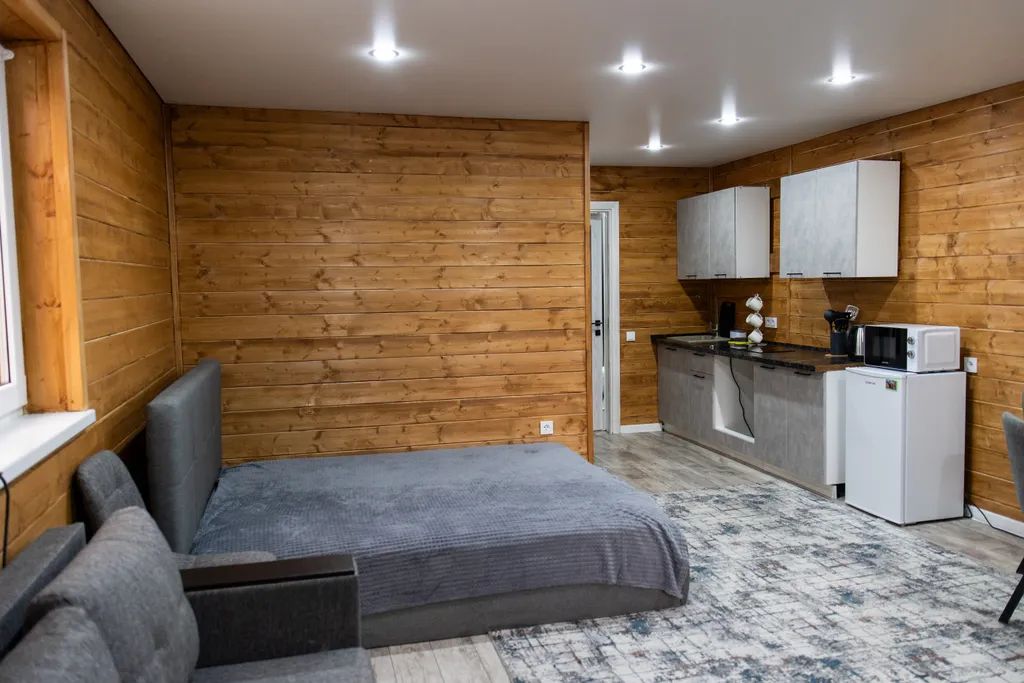 2. Кухня-гостиная с двуспальным диваном и двуспальной кроватью.