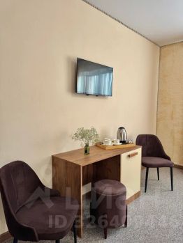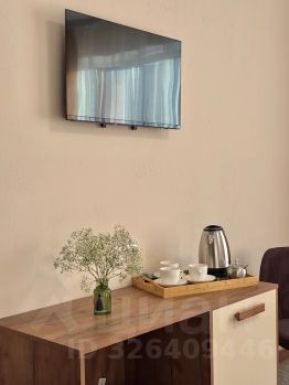 Детали: Два мягких кресла для отдыха, современный телевизор, электрочайник и набор посуды.