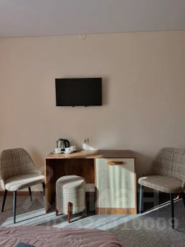 Детали: два мягких кресла для отдыха, современный телевизор, электрочайник и набор посуды.