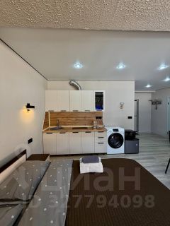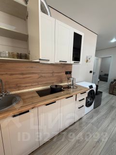 Современная кухня со всей необходимой техникой (плита, чайник, СВЧ), стиральная машина.
