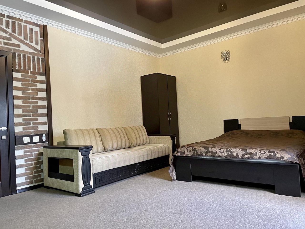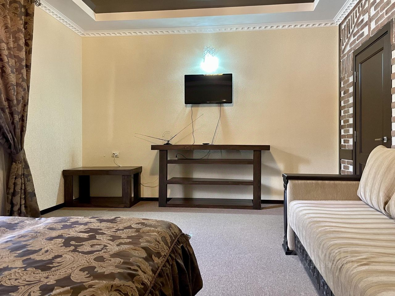 Двухкомнатный номер. В одной комнате большая двухместная кровать, во второй - двухместная кровать и раскладной диван.