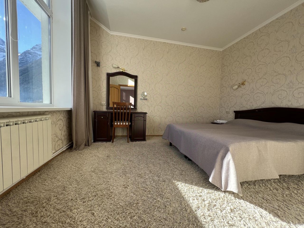 Этот превосходный просторный номер, площадью 55 кв.м. расположен на верхнем этаже гостиницы в новом корпусе. Из широких панорамных окон открывается восхитительный вид на горы, от которого захватывает дух. В номере 2 комнаты: спальня с большой кроватью king-size и гостиная комната. Диван в гостиной раскладывается. Ванная комната оснащена биде и ванной. В номере фен, халаты и тапочки для удобства наших гостей. Суперлюкс находится на отдельном этаже с двумя другими 2х комнатными номерами категории Люкс, с эксклюзивным доступом к оборудованной кухне, уютному холлу с диванами и креслами. На этаже так же имеются 3 отдельные комнаты для размещения охраны или водителей, при необходимости