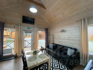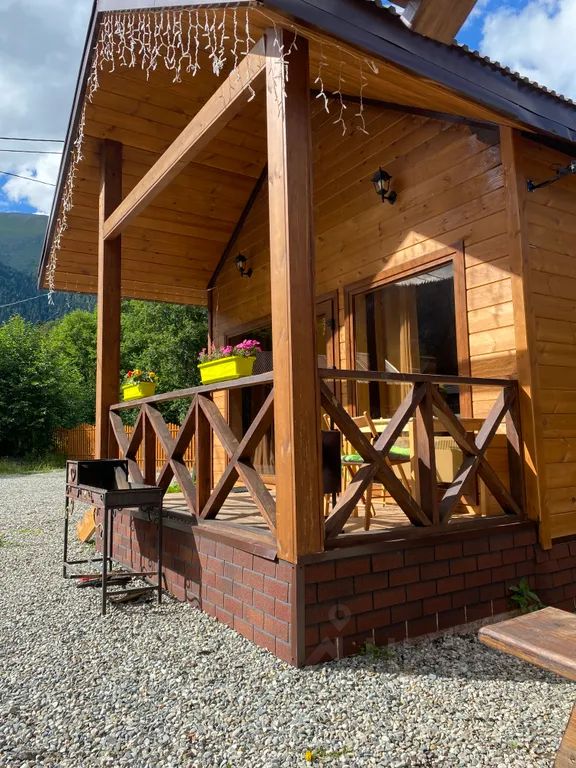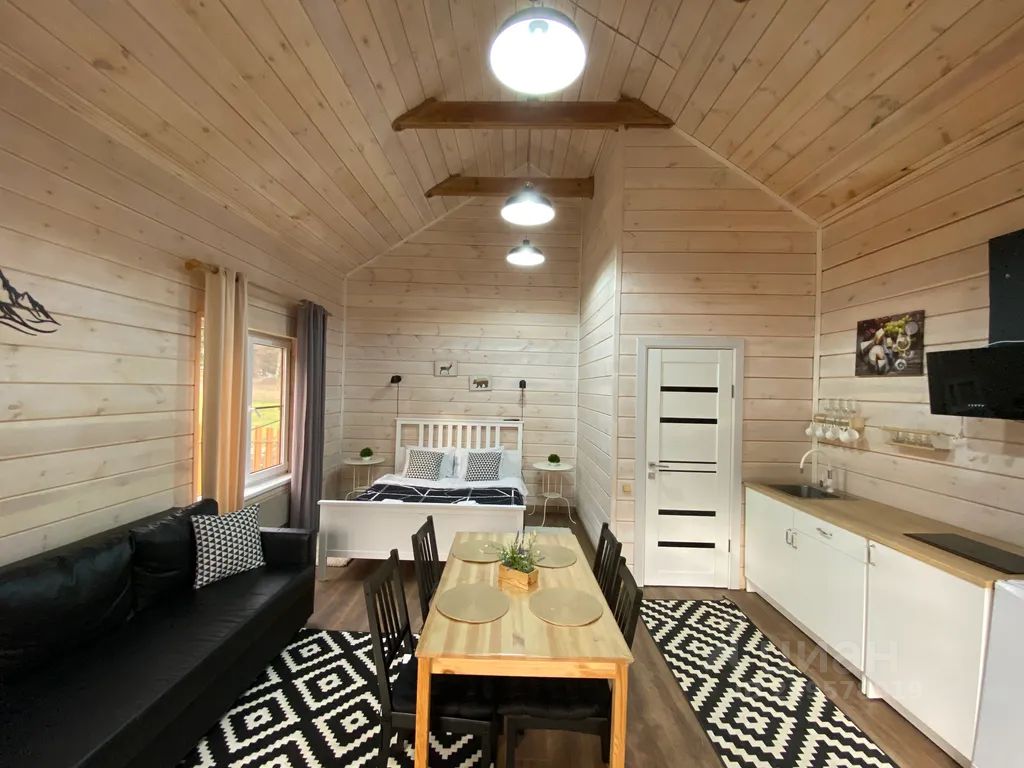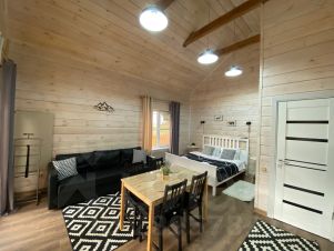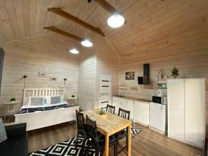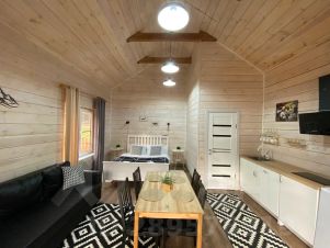 В шале стоит двуспальная кровать (евро) и раскладной диван-кровать, также кухонная зона с обеденным столом, стульями и всем необходимым.