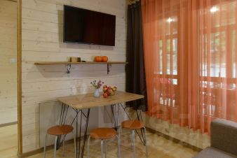 Терраса с садовой мебелью, мангал, холодильник, телевизор, электрочайник, электроплита, СВЧ печь, посуда, чистящие средства, столовые приборы, постель и полотенца.