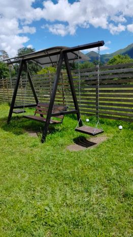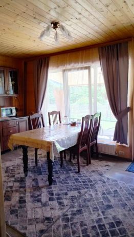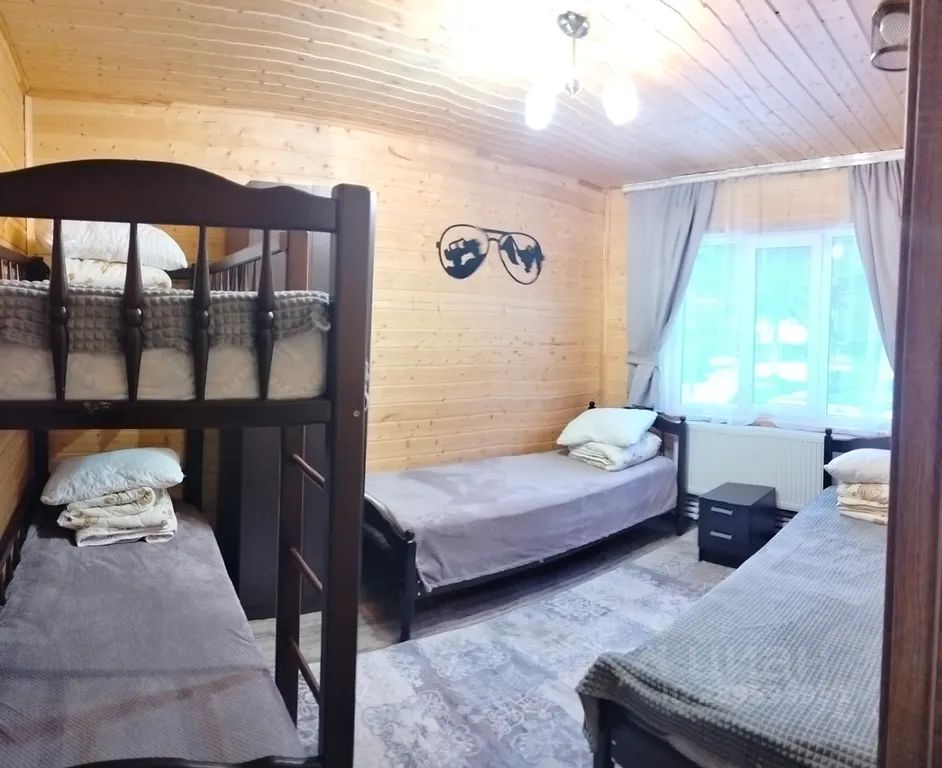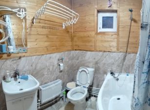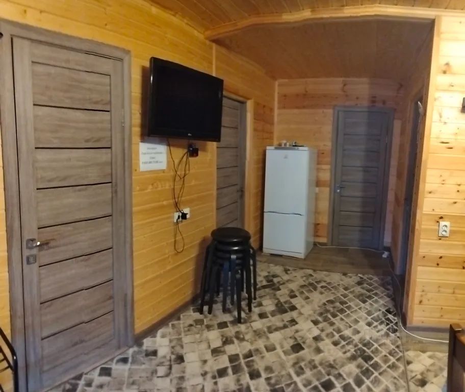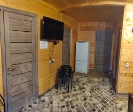 Оснащение гостевого домика: 3 комнаты в доме, 6 кроватей односпальные и 2 двухъярусные кровати, шкаф вещевой в каждой комнате, телевизор, кухонная зона (холодильник, газовая плита/микроволновая печи, электрочайник (вся необходимая кухонная утварь).
