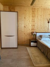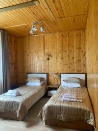 В гостевом доме имеются 3 комнаты с двухспальной кроватью и одноместными спальными местами с высоким уровнем комфорта. Также дополнительно есть возможность разместить 2 человека на раскладывающемся диване. Максимальная вместимость коттеджа - 6 человек. В доме имеется холодильник , стиральная машина, микроволновая печь, индукционная печь , телевизор, современная мебель, и все остальное для комфортного проживания.