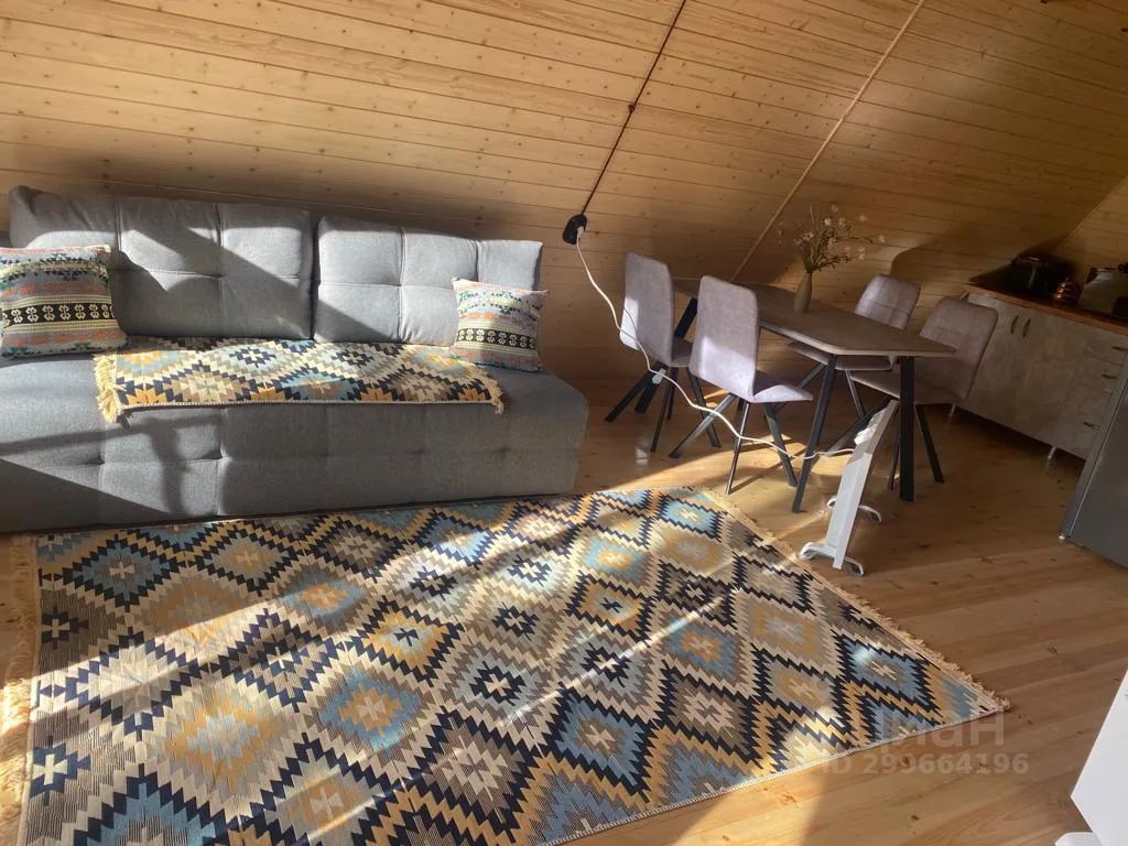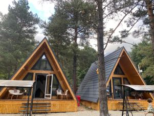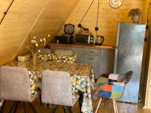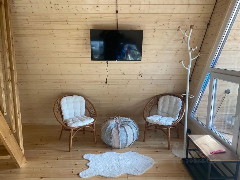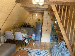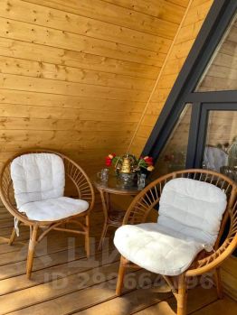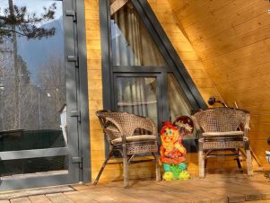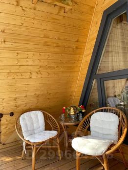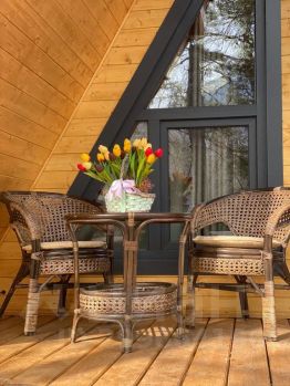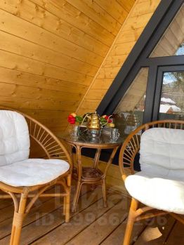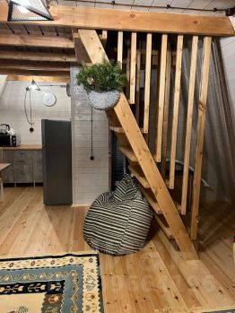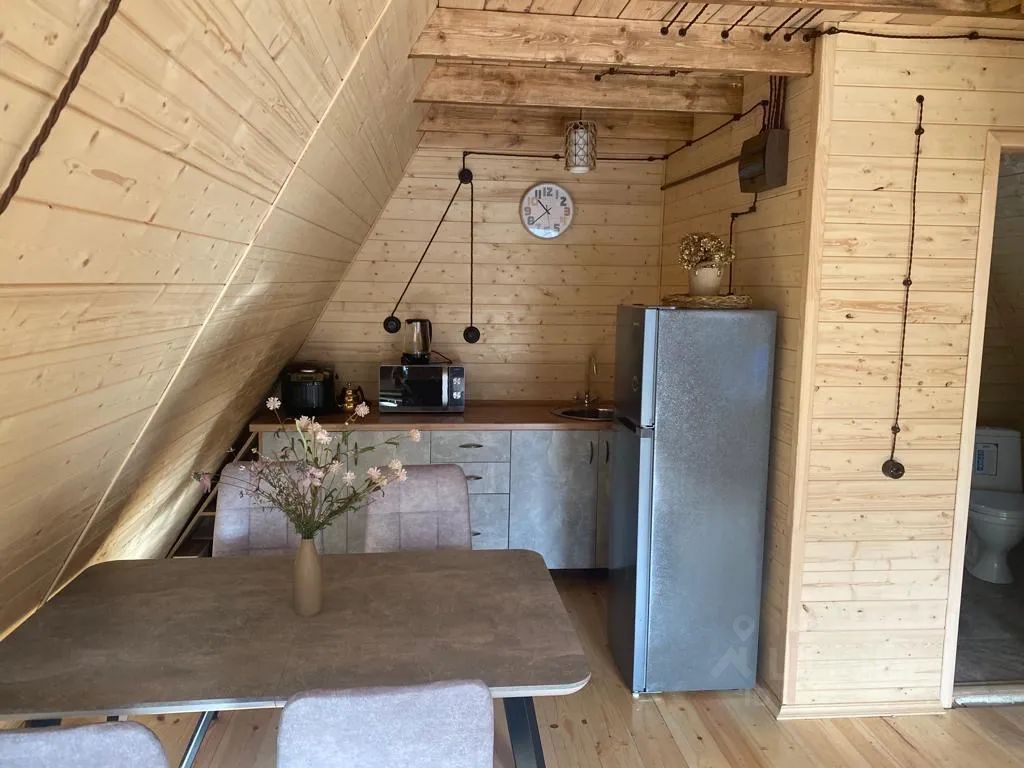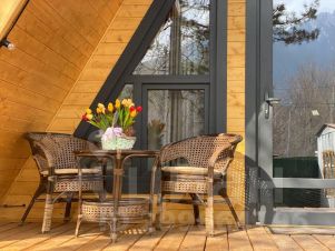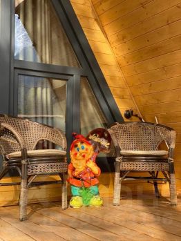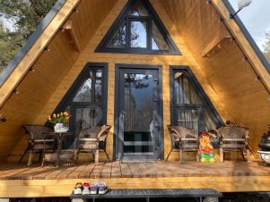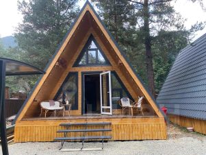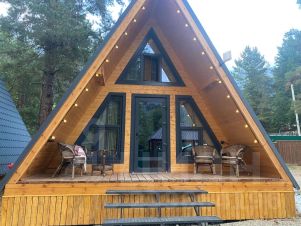 На территории комплекса домик афрейм. Каждый домик рассчитан на 5-6 гостей. В домике есть все для вашего удобства. На втором этаже 2 спальни, не изолированные, на 4х гостей. В коттедже собственная ванна, где имеются все косметические принадлежности, стиральная машина, гостиная и полностью оборудованная кухня. Так же имеется система "тёплый пол". Домик двух этажный.