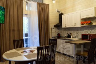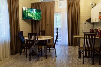 Гостиная с раскладным диваном, обеденной зоной и полноценной кухней. Есть холодильник, микроволновая речь, индукционная плита, телевизор. Полноценный набор посуды на 6 персон и всё необходимое для готовки.