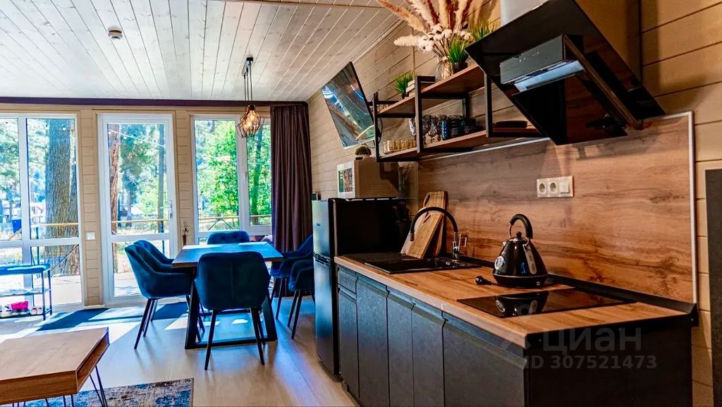 Кухня полностью оснащена современной техникой и необходимой посудой, есть обеденный стол.