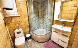 Домик оборудован собственной ванной комнатой со всеми удобствами: душевая кабина, душ, фен, зеркало, раковина, разовые зубные щетки, мыло, шампунь, гели для душа, комплект свежих полотенец, удобные тапочки, унитаз, гигиенический душ, мусорное ведро.