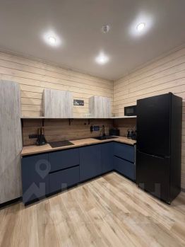 Кухня-гостиная: холодильник, посудомоечная машина, тостер, посуда, микроволновая печь, чайник, стол, стулья, раскладной диван, tv.
