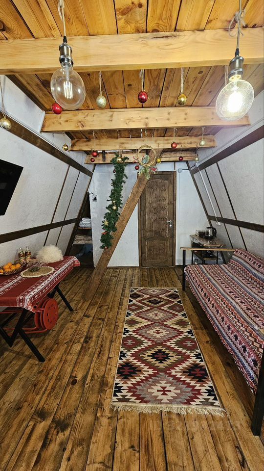 Внизу шале гостиная зона - диван, вешалка для одежды, обеденный стол, холодильник, посуда, чайник.