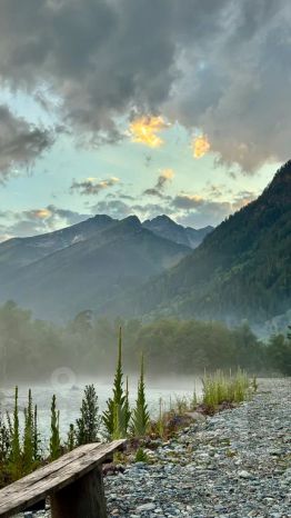 4 шале в хвойном лесу на берегу горной реки