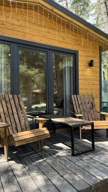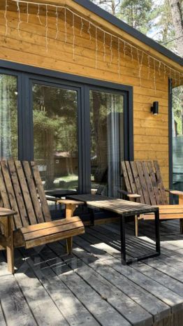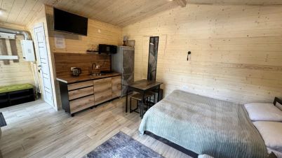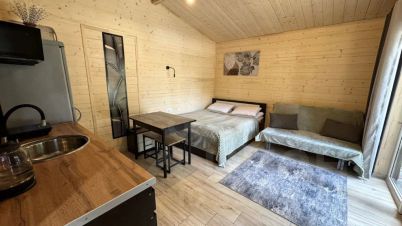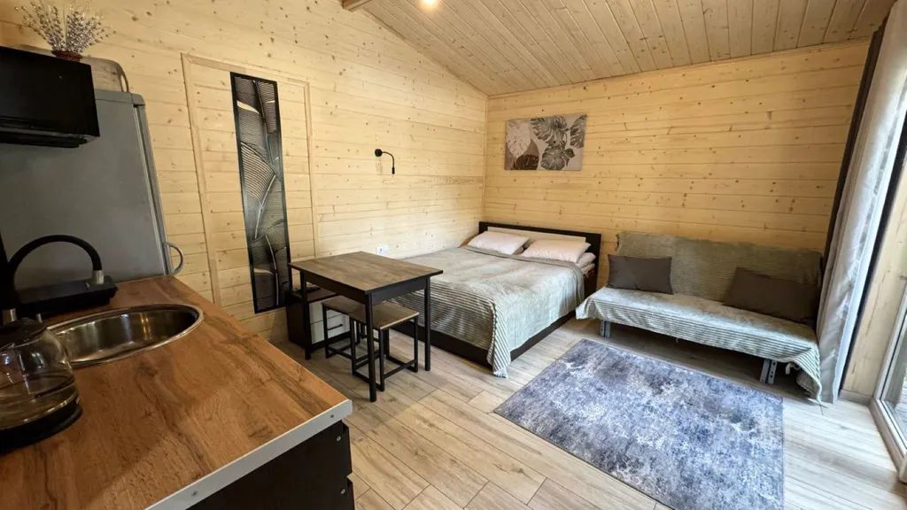 В доме есть обеденная зона и кухня, оборудованная электрической плитой, мини-холодильником с морозильной камерой, электрическим чайником, посудой (сковородка, кастрюля, тарелки, бокалы, столовые приборы), телевизором и Wi-Fi. Санузел оборудован туалетом, душем, раковиной, зеркалом, феном, тапочками, мылом и полотенцами для каждого гостя.