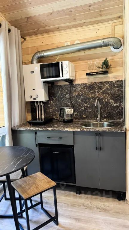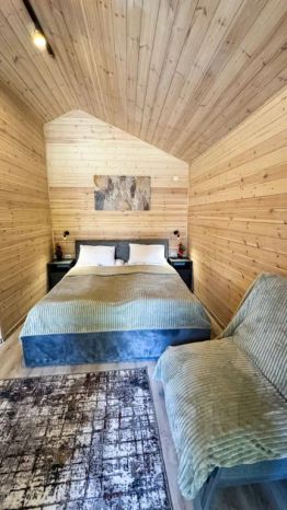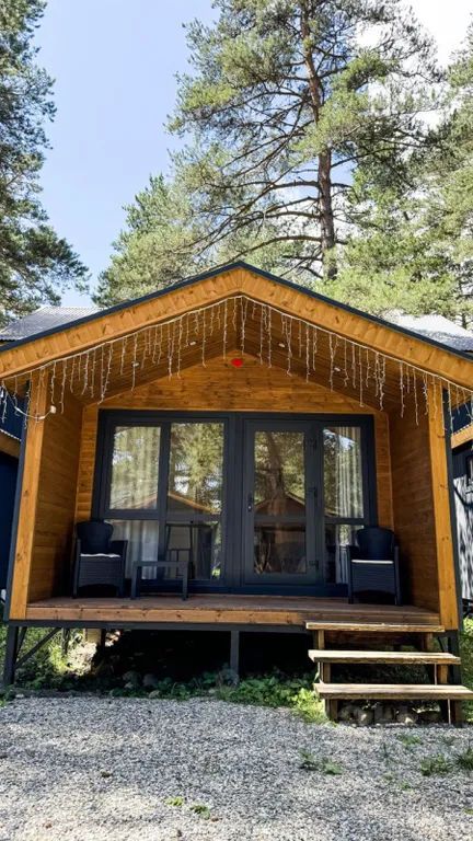 В доме есть обеденная зона и кухня, оборудованная электрической плитой, мини-холодильником с морозильной камерой, электрическим чайником, посудой (сковородка, кастрюля, тарелки, бокалы, столовые приборы), телевизором и Wi-Fi. Санузел оборудован туалетом, душем, раковиной, зеркалом, феном, тапочками, мылом и полотенцами для каждого гостя.