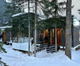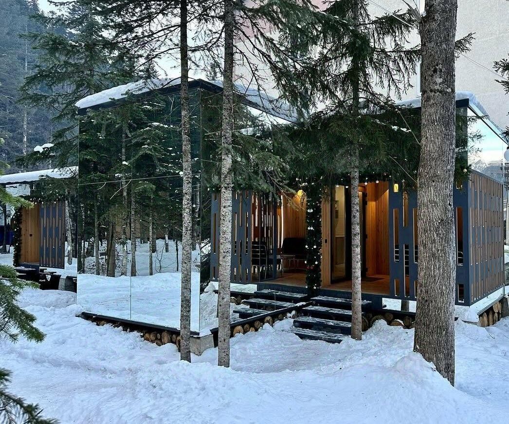 Времена года Village - место, где природа Домбая становится частью вашего отдыха. Здесь уютные коттеджи спрятаны среди вековых пихт, а горная речка наполняет пространство звуком живой воды. Это идеальное место для романтического уикенда, семейного отдыха или встреч с друзьями. Всего в нескольких минутах находятся подъёмники и лучшие туристические маршруты региона. Для размещения гостям предлагаются уютные коттеджи, таунхаусы и А-фреймы различных категорий и вместимости, оборудованные всем необходимым для комфортного проживания: комфортабельные спальные места, оборудованные техникой и посудой кухня, санузел с душем. Гостям предоставляются постельное белье и полотенца. На территории гостей ждут банные чаны под открытым небом, костровая зона, бассейн. Уютный зеркальный таунхаус для комфортного отдыха в пихтовом лесу Домбая. Идеально подойдёт для компании до четырёх человек — в доме предусмотрена отдельная спальня с двуспальной кроватью и гостиная-кухня с удобным раскладным диваном. Пространство оборудовано всем необходимым для вашего проживания: кухня с посудой, ванная комната, обеденная зона и уютное место для отдыха.