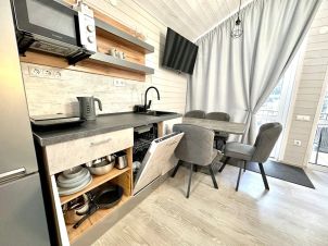 оборудованная кухня (микроволновая печь, мойка, индукционная плита, большой и вместительный холодильник с морозильной камерой, чайник, посуда для приготовления и приема пищи)