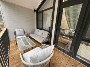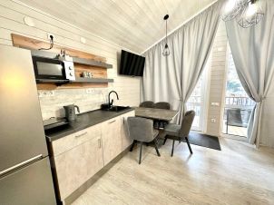 современный двухкомнатный дом с панорамными окнами в пол со шторами blackout и шикарным видом на реку.