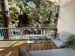 крытая терраса с видом на реку, оборудованная уличной мебелью