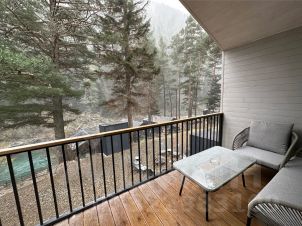 Крытая терраса с видом на реку, оборудованная уличной мебелью