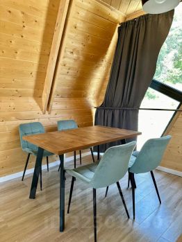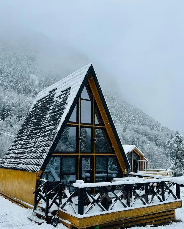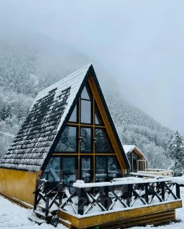 Мы предлагаем вам уютные домики в стиле a-frame, расположенные между Архызом и п. Романтик рядом с Софийской поляной с видом на горы,реку и лес.